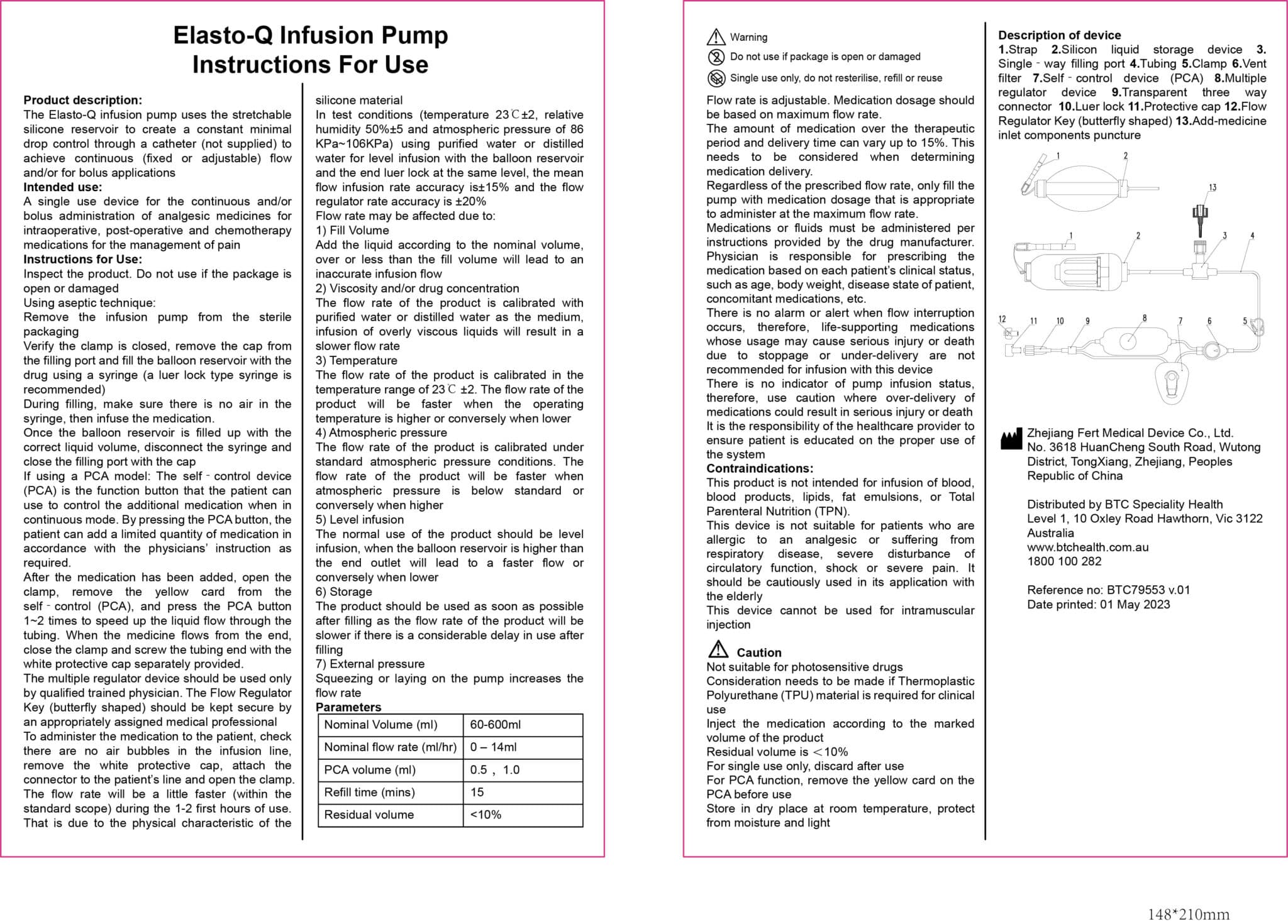 | 200302852 | 2605978 | TBC | Elasto-Q Pump 200ml, Continuous, Bolus function, (Soft shell), Bolus vol. 0.5ml/min (if with PCA) Regulator flow rates (2-14ml) 2/4/6/8/10/14 |
